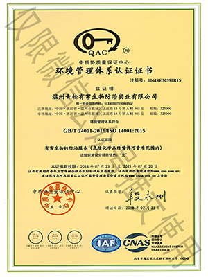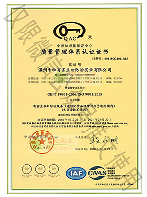 國家級有害生物防制認(rèn)證機(jī)構(gòu)A級證書/浙江省病媒生物防制服務(wù)機(jī)構(gòu)能力等級一級資質(zhì)