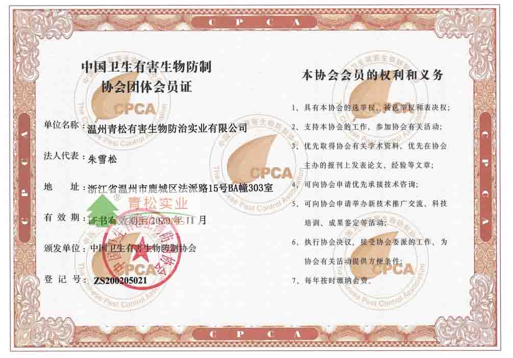 中國(guó)衛(wèi)生有害生物防治協(xié)會(huì)團(tuán)體會(huì)員證證書