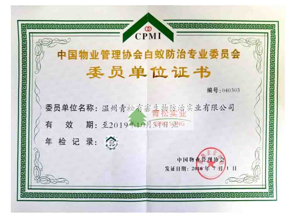 中國(guó)物業(yè)管理協(xié)會(huì)白蟻防治專業(yè)委員會(huì)委員單位證書